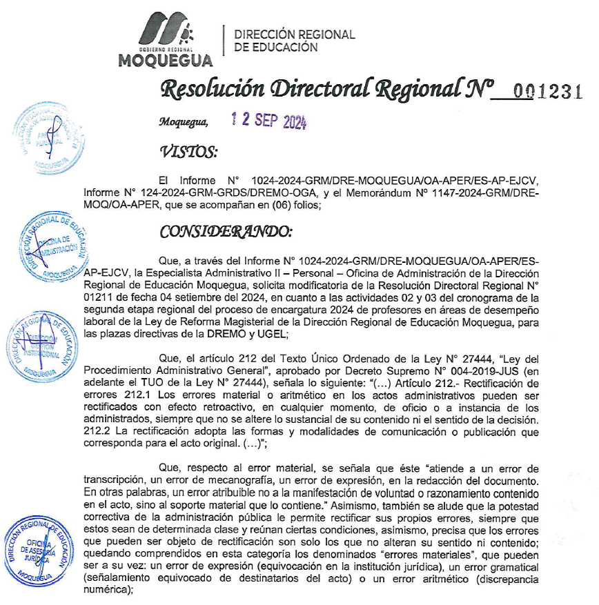 Resolucion Directoral Regional Nº 001231-2024 DRE.MOQ. Post navigation Previous CONVOCATORIA Nº 023-2024 UGEL GSC ENCARGATURA DE CARGOS DE MAYOR RESPONSABILIDADNext Encargatura en las plazas de Director de UGEL, Director y Jefe de Gestión Pedagógica de DRE y UGEL More Stories Comunicados COMUNICADO Nº 032-2025 ADJUDICACIÓN CONTRATACIÓN DOCENTE 2025 I.E. TASSA 13 de octubre de 2025 Nitram Comunicados CONVOCATORIA 005-2025 RÉGIMEN DEL D.L. 276 – UGEL G.S.C. – ESPECIALISTA ADMINISTRATIVO – ABASTECIMIENTOS 13 de octubre de 2025 Nitram Comunicados COMUNICADO Nº 031-2025 ADJUDICACIÓN CONTRATACIÓN DOCENTE 2025 I.E. 43124 6 de octubre de 2025 Nitram